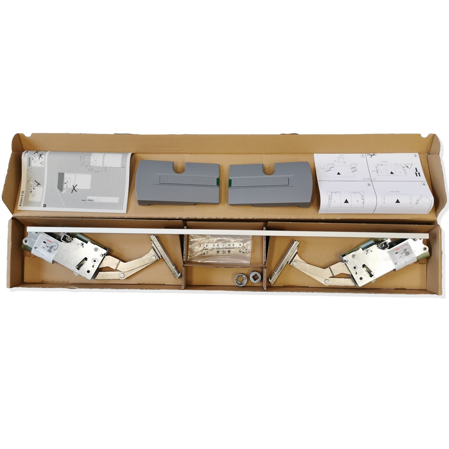 Raccordo a ribalta girevole Kinvaro S-35 con supporto di apertura e smorzamento di chiusura regolabile, con tappi di copertura grigi, del produttore GRASS (Hetal). Set completo